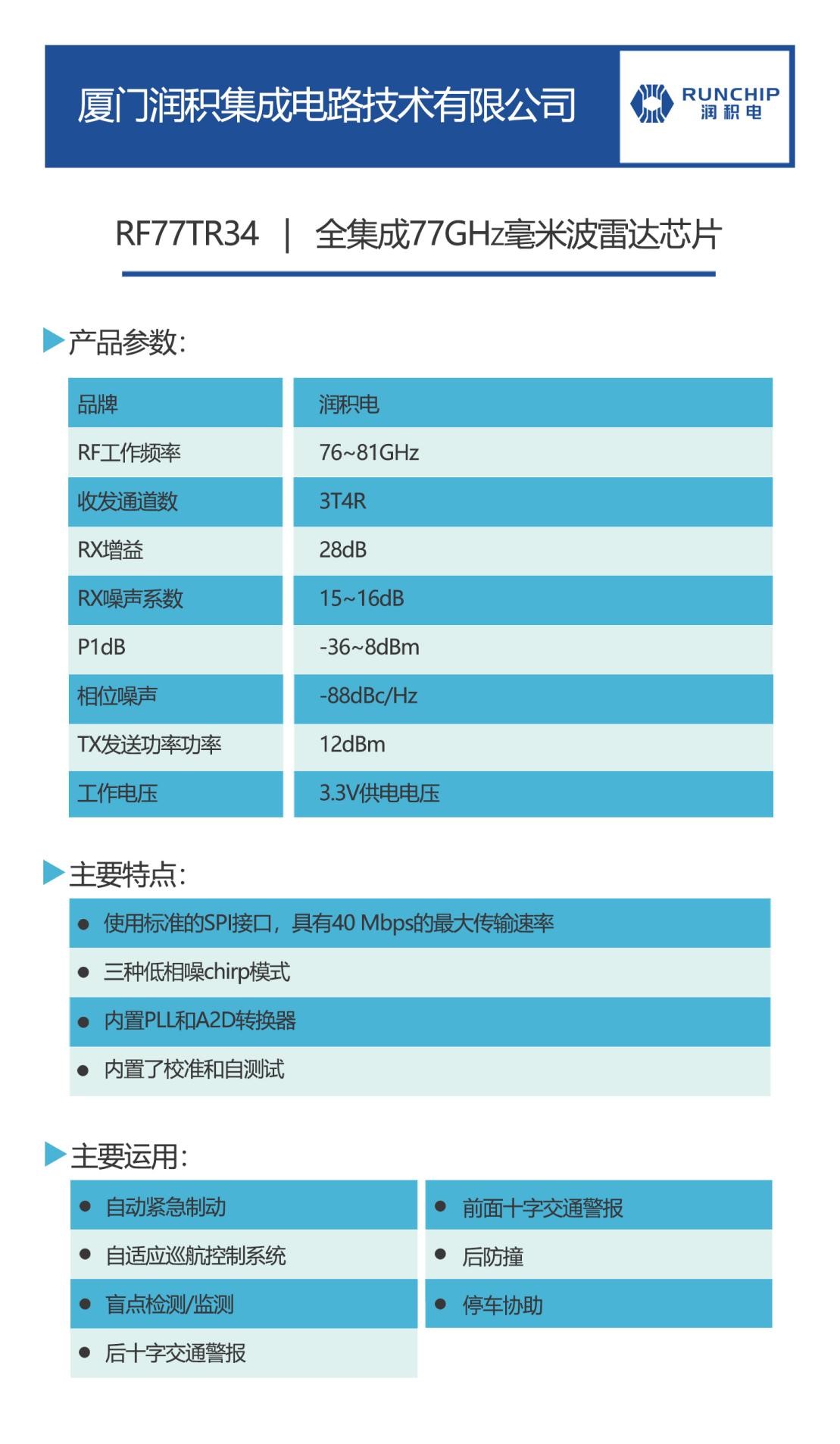 日前,歷經(jīng)近三年研發(fā),廈門(mén)潤(rùn)積集成電路技術(shù)有限公司(以下簡(jiǎn)稱(chēng)潤(rùn)積電)推出77GHz毫米波雷達(dá)芯片RF77TR34,采用RFCMOS工藝,集成了收發(fā)機(jī)(3T4R)、PLL、VCO等,主要功能性能達(dá)到國(guó)際主流同行水平,最快2022Q1可以向客戶提供評(píng)估樣品。